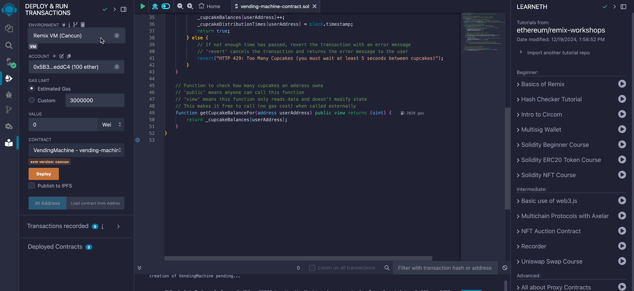 VendingMachinecontract to theLocalhostnetwork, then go to the "Deploy & Run Transactions" tab and click "Deploy."